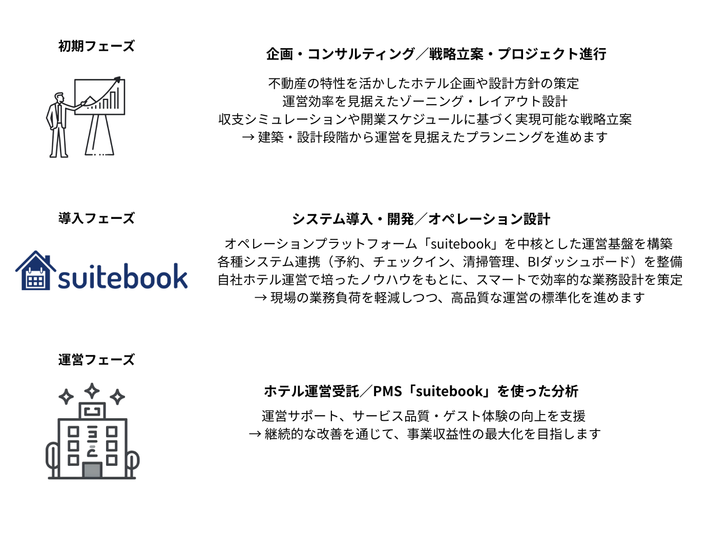 独自の宿泊管理システム「suitebook」を活用し、現場オペレーションと経営データを統合。運営効率と体験価値を両立する仕組みの構築を実現してまいります。