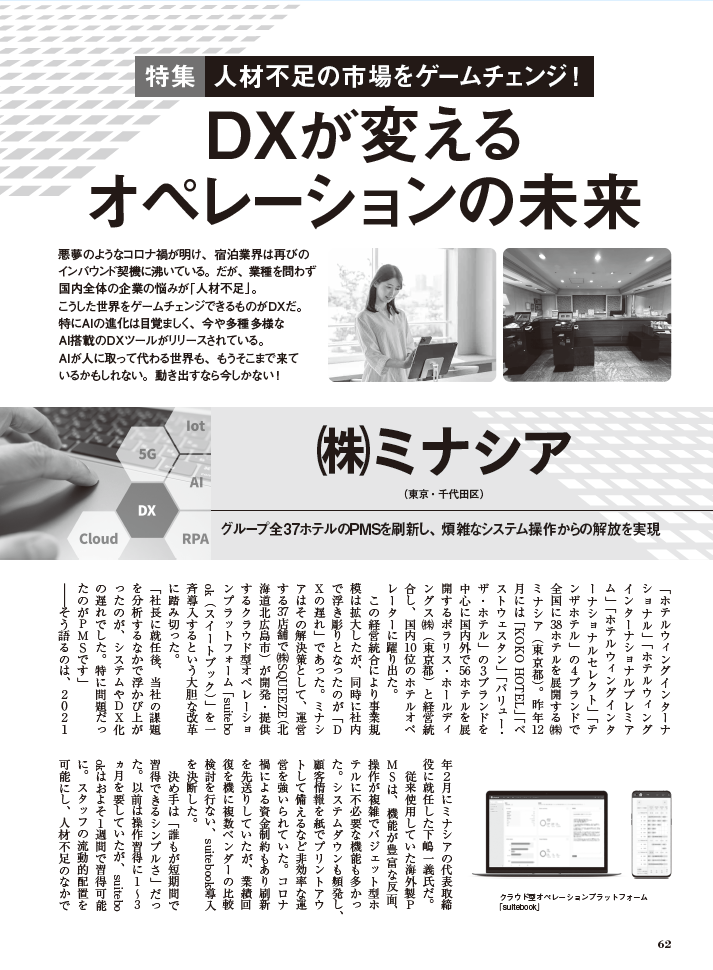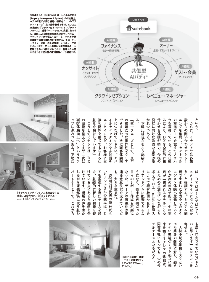 『ホテル旅館』(2025年10・11月号)にて、SQUEEZEが開発・提供するクラウド型オペレーションプラットフォーム「suitebook」が、株式会社ミナシアのDX事例として紹介されました。