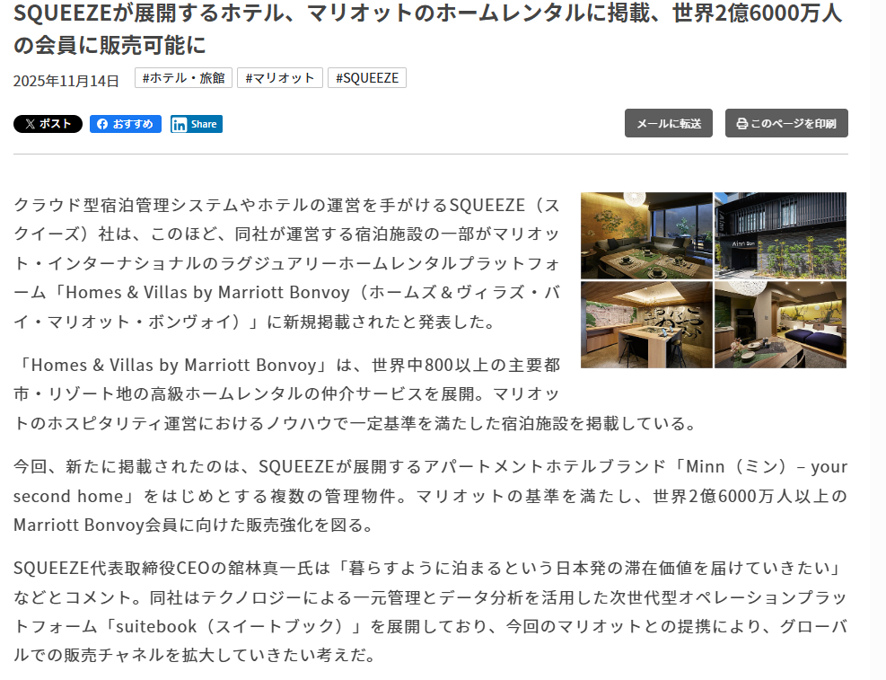 トラベルボイス(2025年11月14日)にて、SQUEEZEが展開する「Minn」ブランドがマリオットの「Homes & Villas by Marriott Bonvoy」に加入したことが紹介されました。