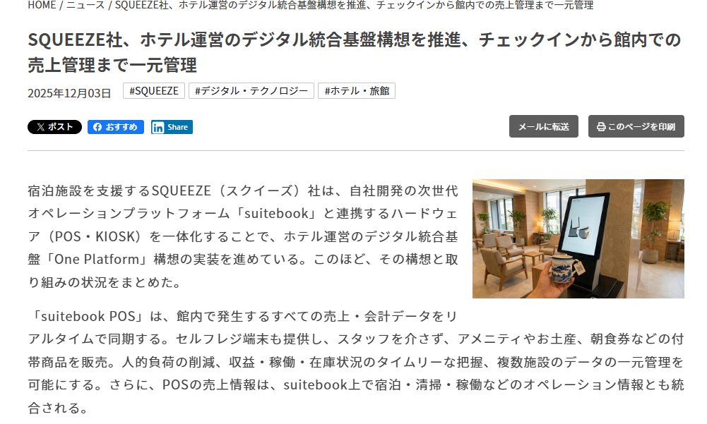 トラベルボイス(2025年12月3日)にて、「suitebook」と連携するハードウェア(POS・KIOSK)について紹介されました。