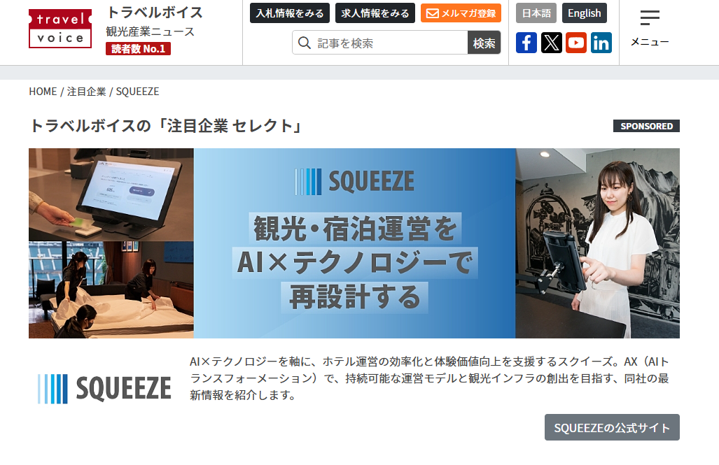 トラベルボイス(2025年12月)より、SQUEEZEがトラベルボイスの「注目企業 セレクト」に掲載されています。
