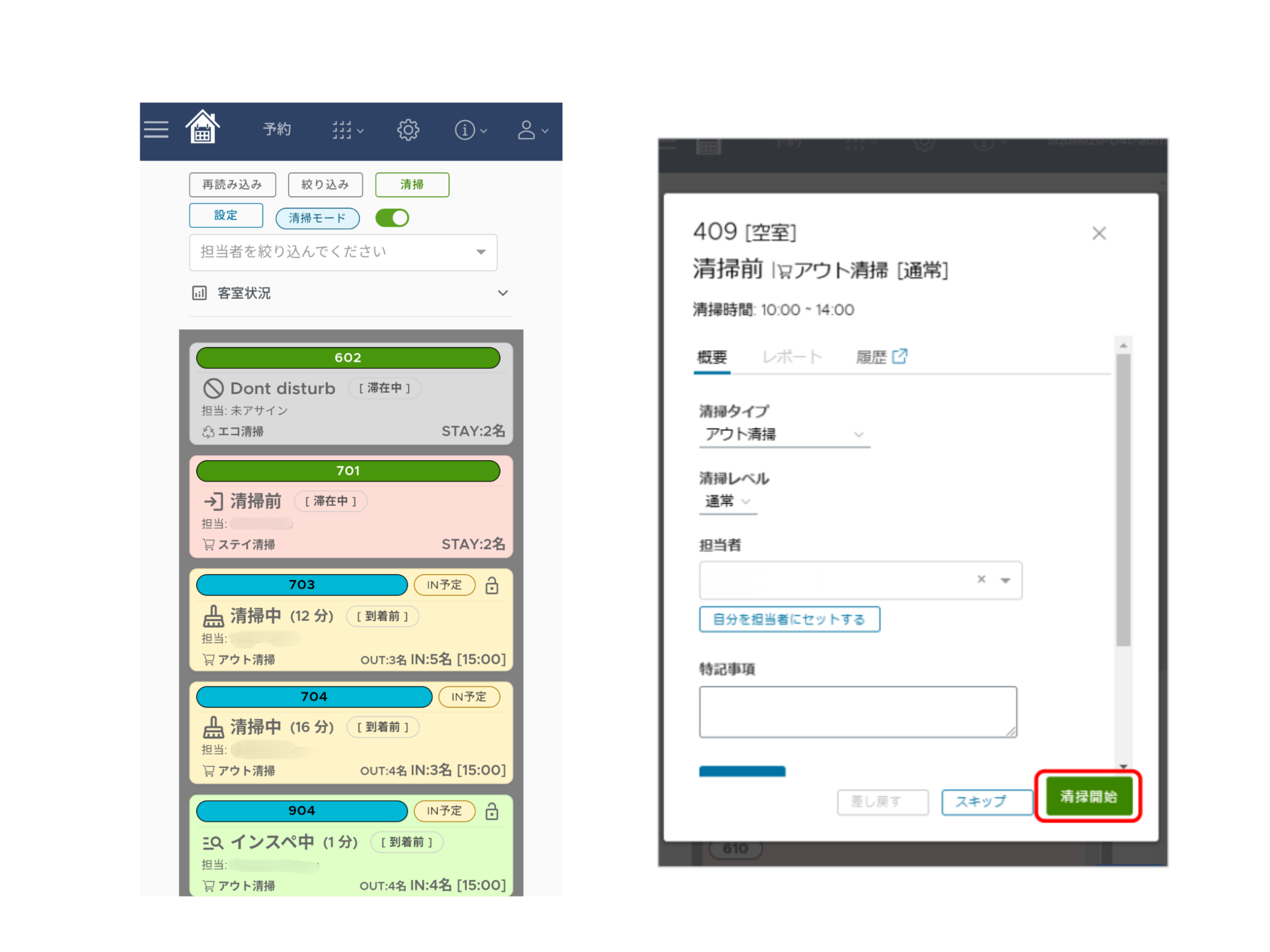 各客室の清掃状況をリアルタイムで可視化することで、進捗確認のための連絡や個別の確認作業を削減します。清掃スタッフ自身も担当客室の進捗を即時に共有できるため、紙での報告や電話連絡が不要となり、情報伝達のスピードと正確性が向上します。