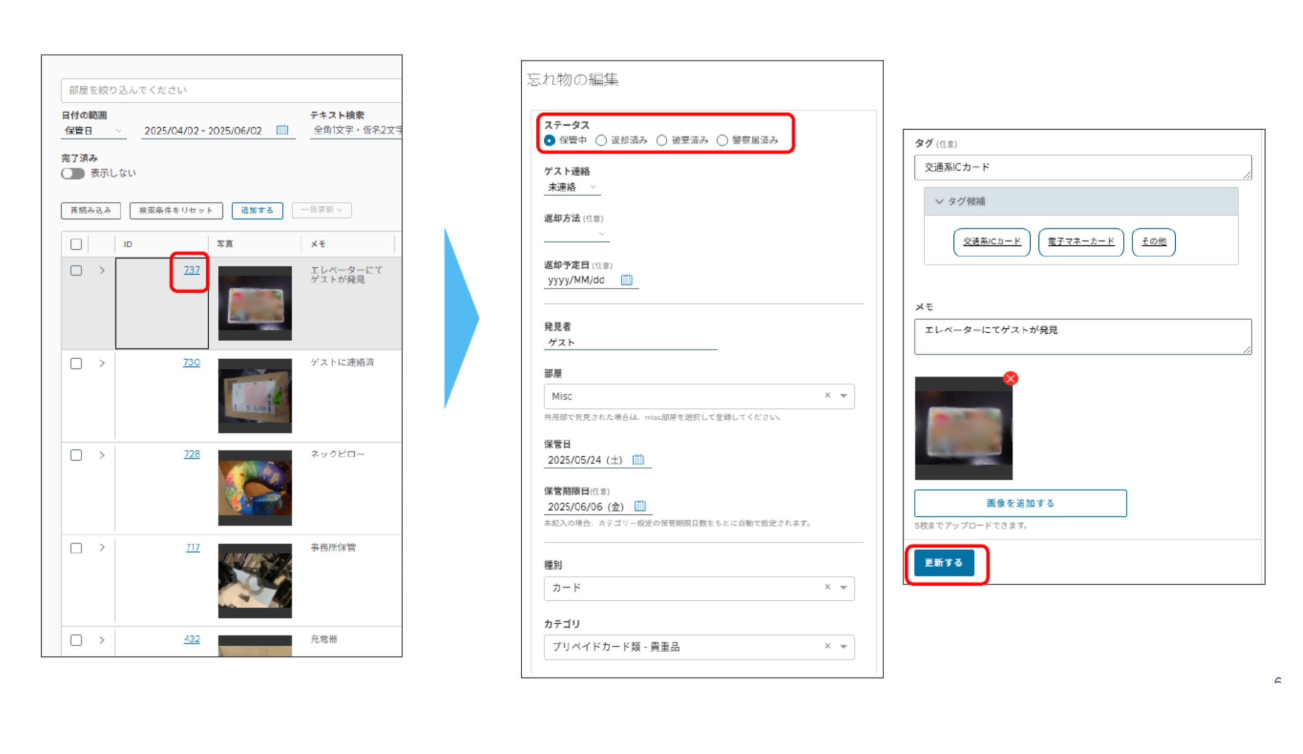 清掃業務の中で忘れ物が発見された時点から、予約情報と連動してデータが即時に共有されるため、現場からフロント、本部までの情報伝達にタイムラグが生じません。その結果、施設にいなくても、別拠点や本部から忘れ物の状況を確認し、ゲストからの問い合わせに対応することが可能になります。
