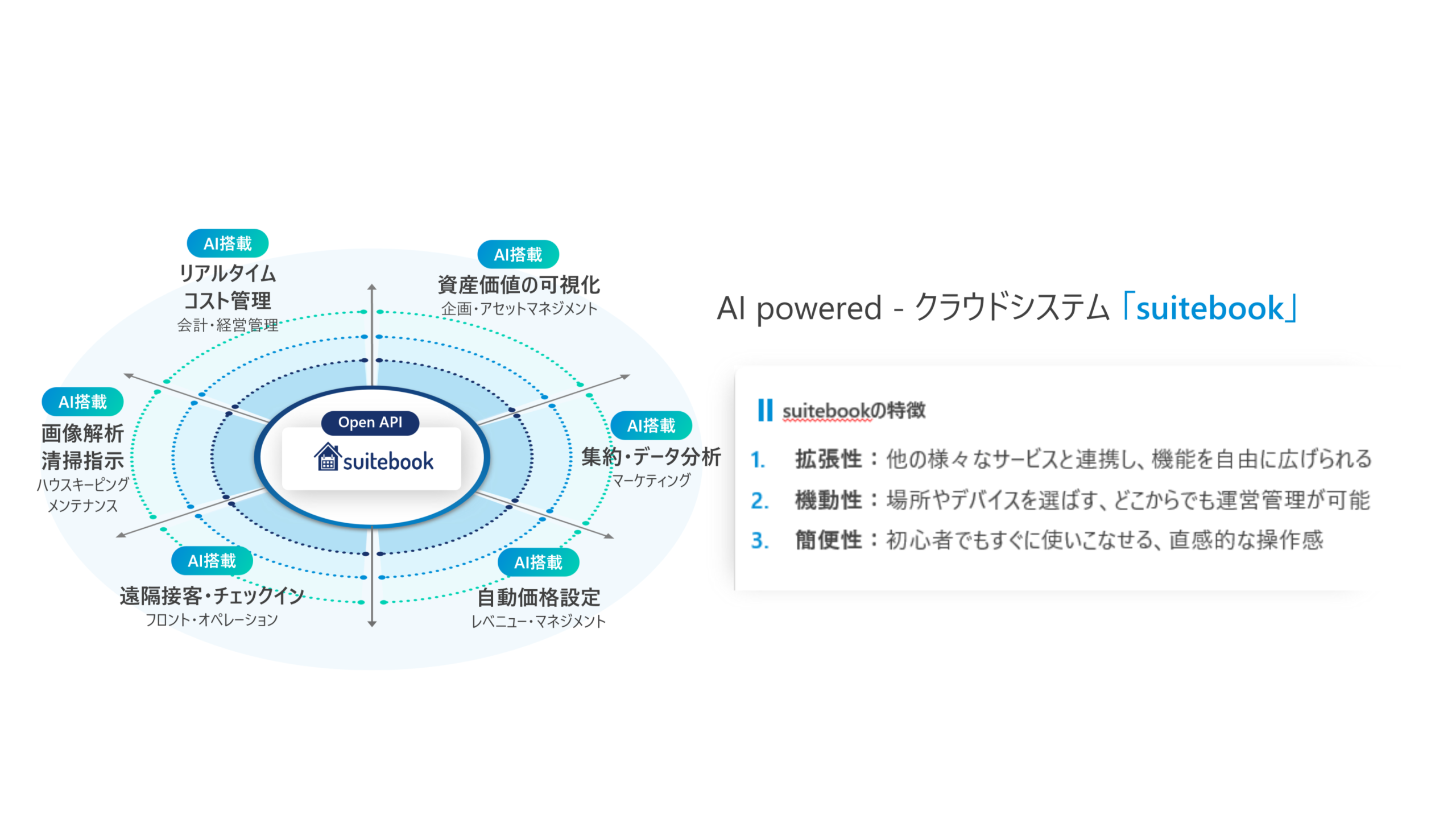 事業内容:クラウド型宿泊管理システム「suitebook」を中心としたAX(宿泊運営のデジタル変革)プラットフォームの提供、AIを活用した収益最大化や業務効率化の支援、ホテル・宿泊施設の企画・運営、遠隔接客や清掃などの運営サポートサービス
