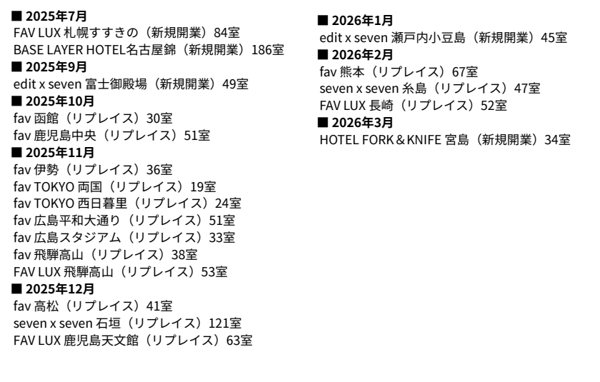 fav、FAV LUX、seven x seven、edit x seven、BASE LAYER HOTELなど複数ブランドにまたがり、全国主要都市および観光地に展開する施設で導入が進んでいます。